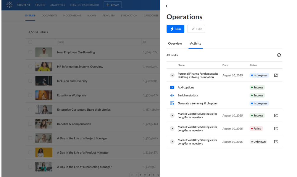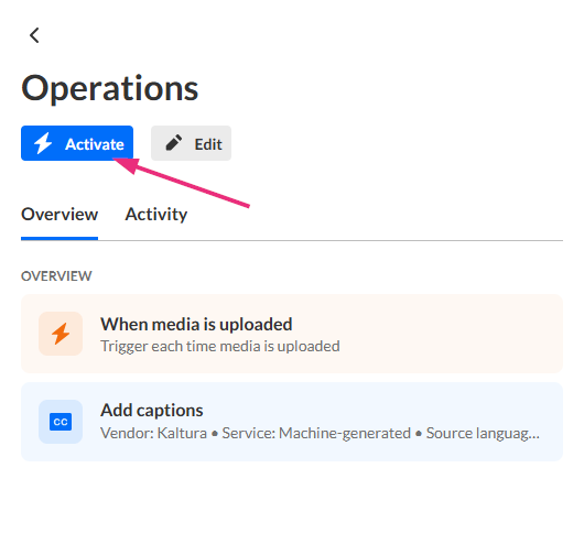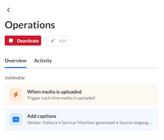 Once you've configured an agent with a desired trigger and actions, you can activate or run the agent. This article will guide you through the process of activating or running a Kaltura agent, depending on the type of trigger your chose for your workflow.