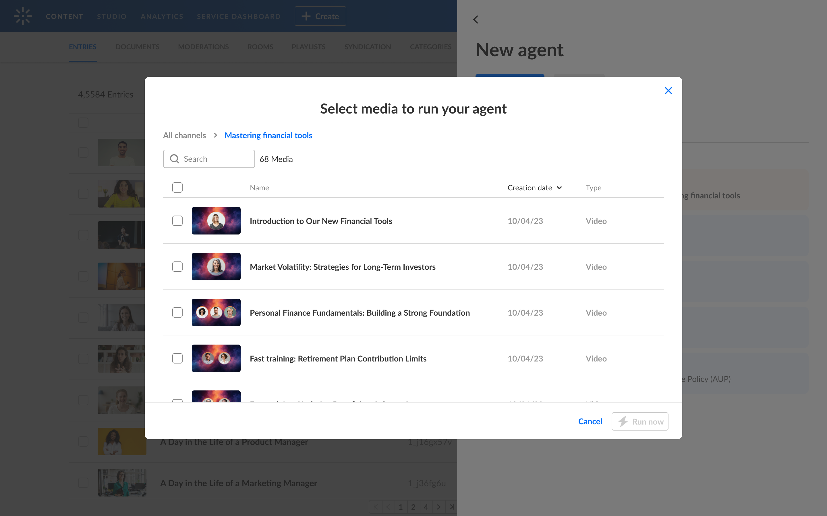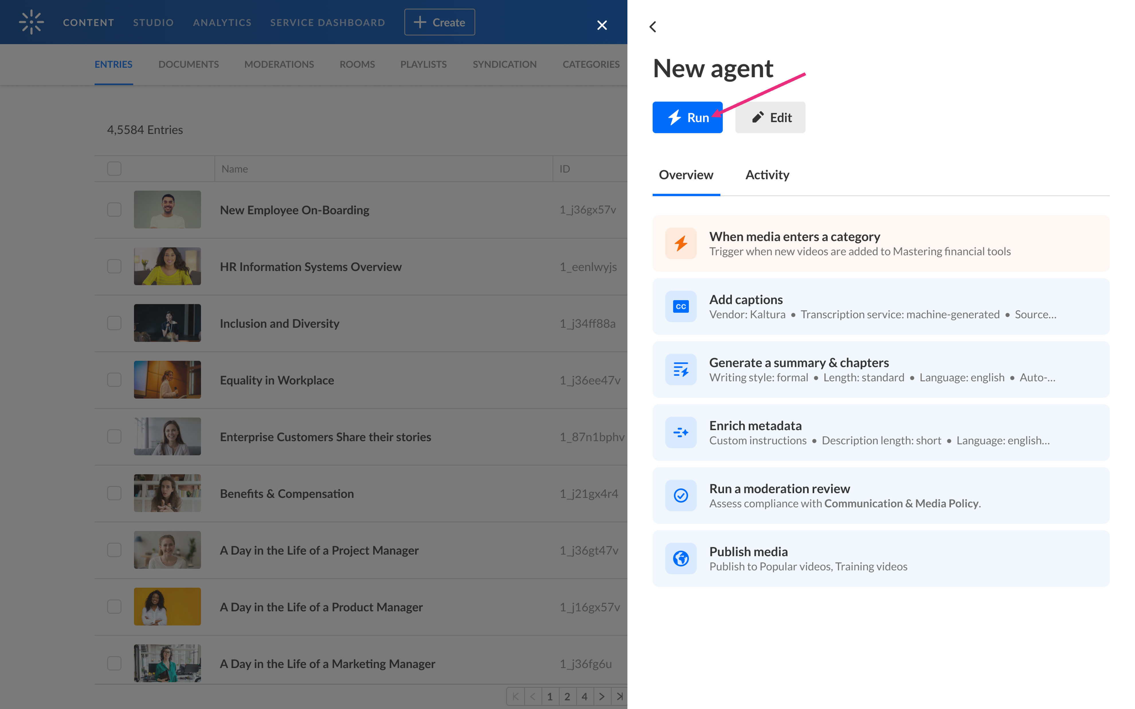- When media is uploaded, the agent runs automatically every time an entry finishes processing and reaches 'Ready' status.
