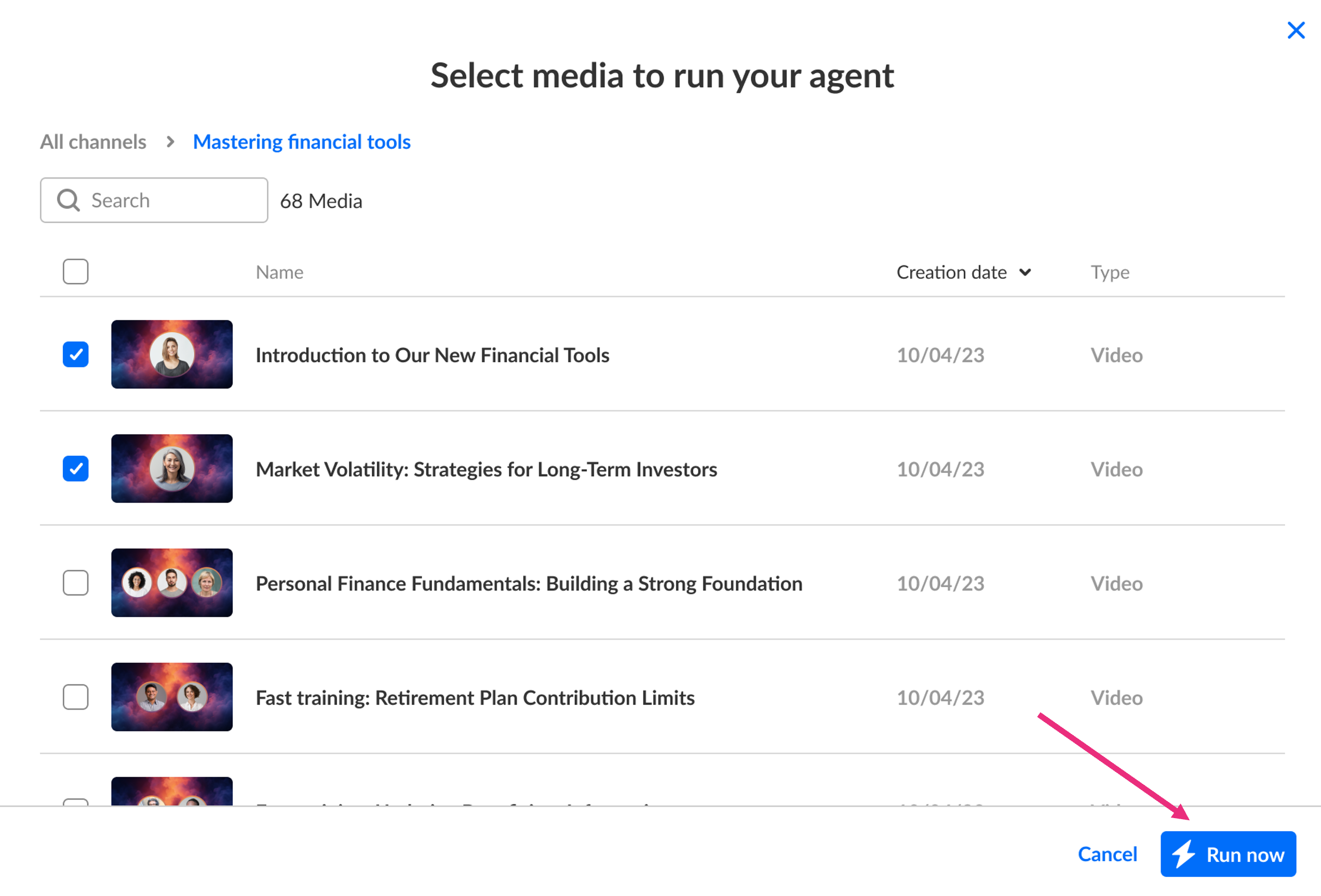 - Click Run now at the bottom right to start the agent (the Run now button becomes active once at least one entry is selected).