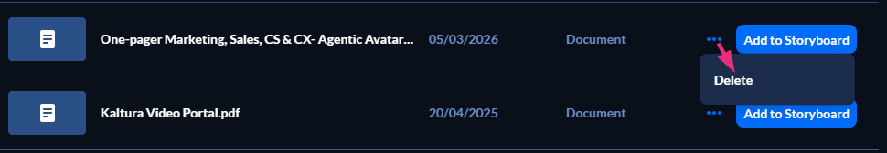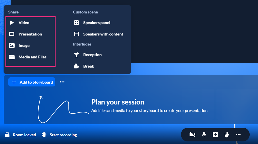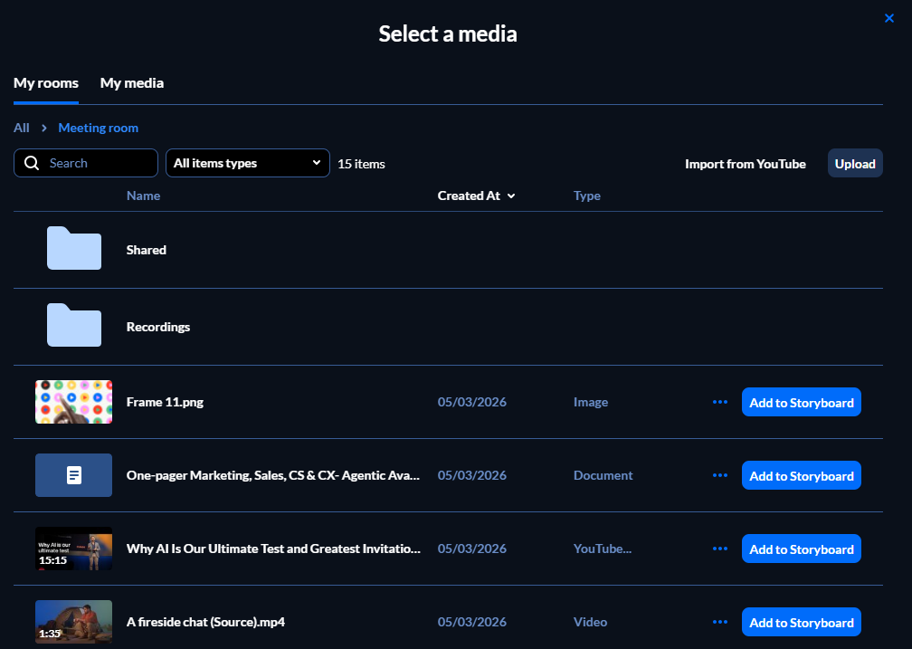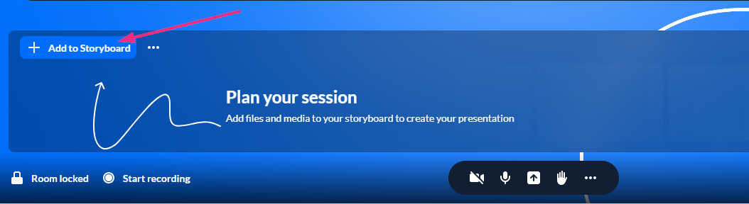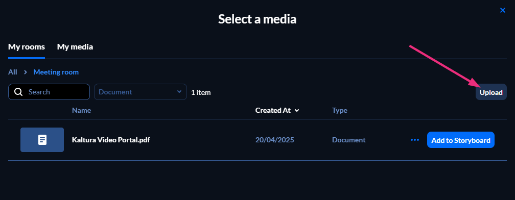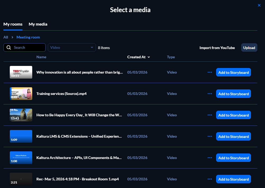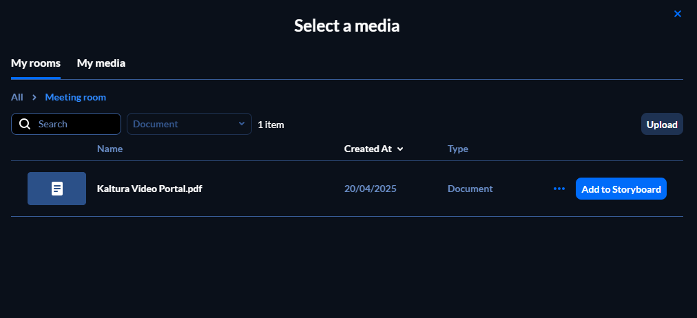 You can prepare presentations and media for your Kaltura Room using the storyboard. Upload files in advance and organize them so they are ready to present during your session.