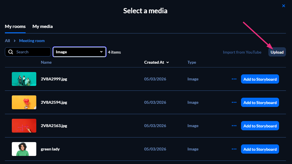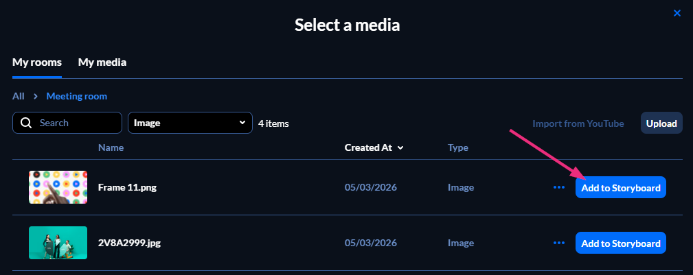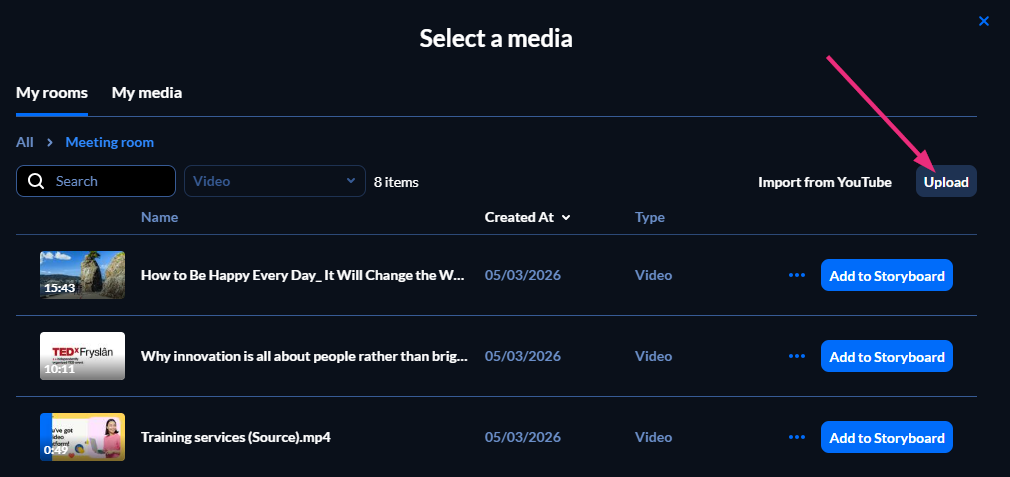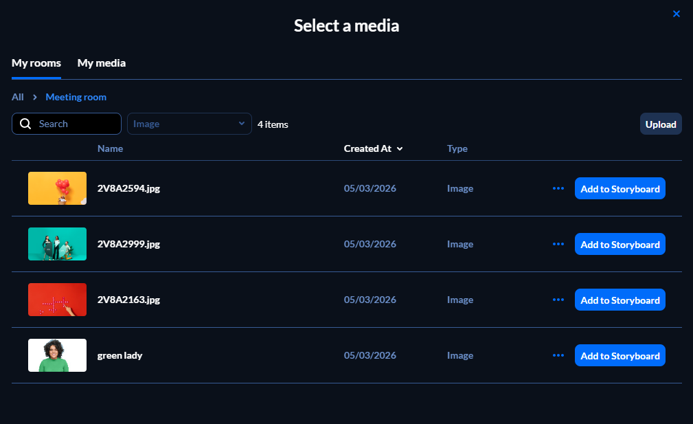 - Upload a file – Click the Upload button at the top right, select the file from your computer, then click Add to Storyboard once the upload completes.