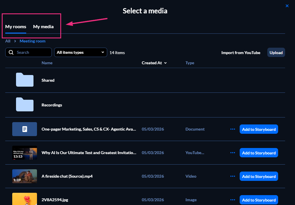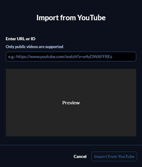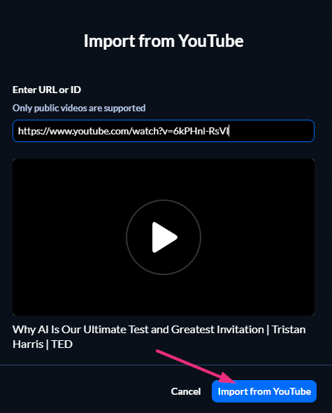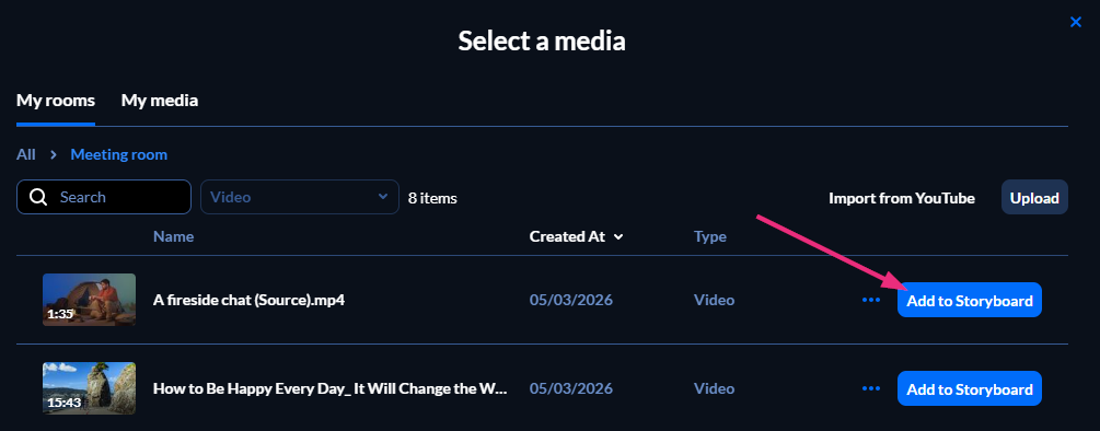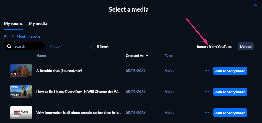 - Import a YouTube video – Click the Import from YouTube button at the top right, paste the video URL or ID, then click Import from YouTube. Once the video appears in the list, click Add to Storyboard.