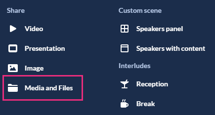 The Recordings folder also appears in the 'Select a media' window when you select Media and Files from the storyboard menu. Completed session recordings are automatically added to this folder.