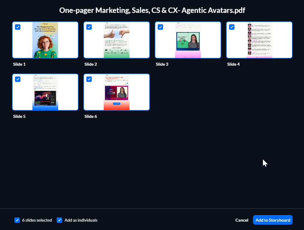 - Add as individuals (default) – Each slide is added as a separate storyboard item