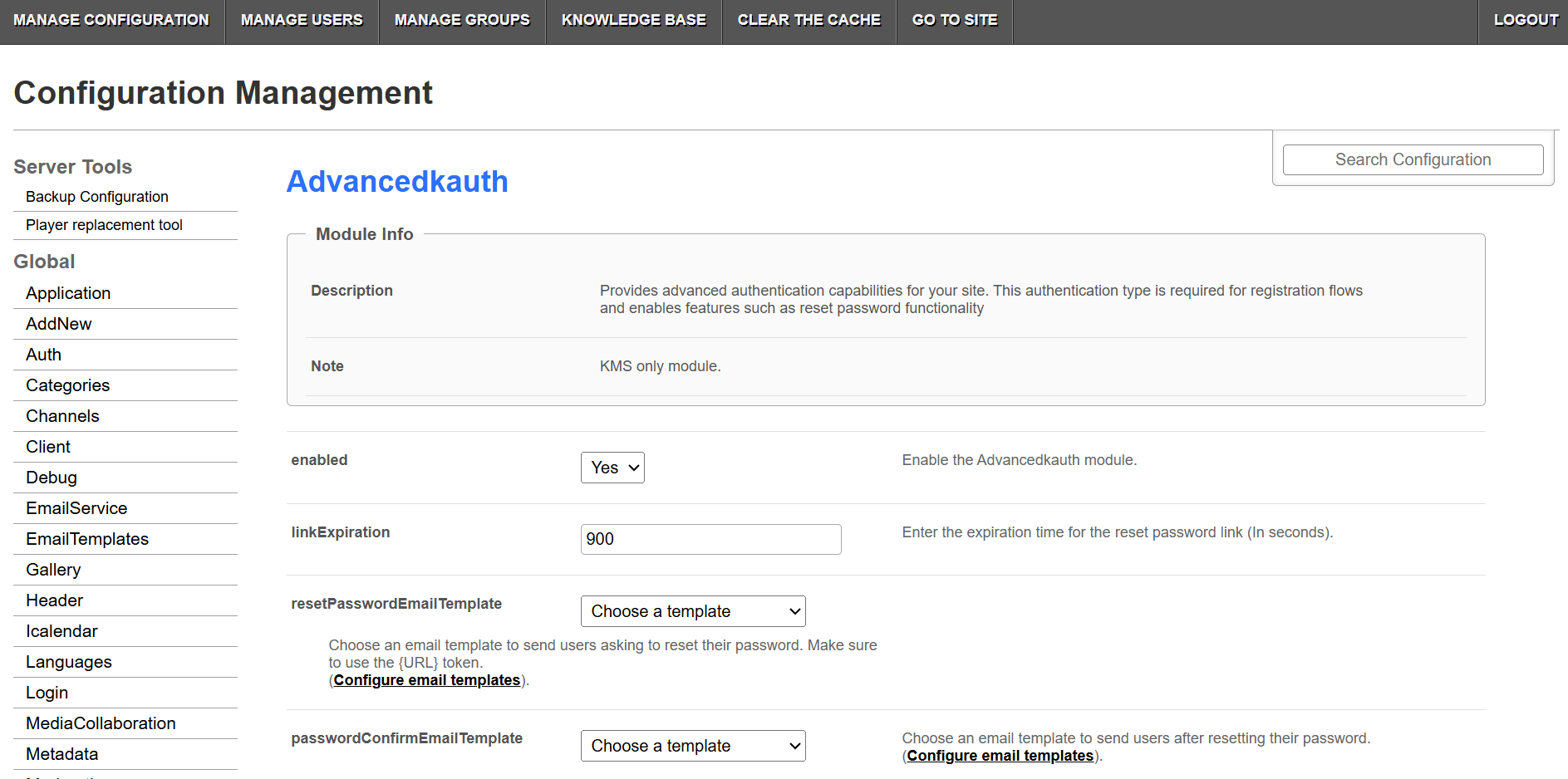 passwordConfirmEmailTemplate - Select the email template sent to users after they successfully reset their password. Click Configure email templates to open the emailtemplates module where you can set up your email templates.