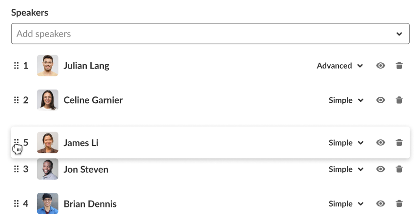 To manually reorder speakers, grab the 6 dots to the left of the speaker number and drag to the desired spot in the list.