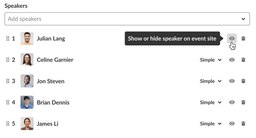 To show or hide a speaker on the event site, click the "eye" icon. Speakers who are marked as hidden are still shown here in the Speaker list but appear "grayed out" and do not have an order number.