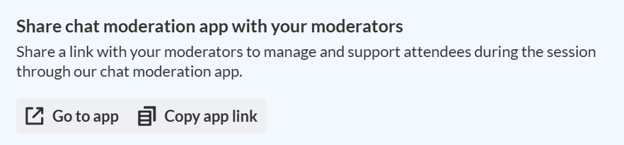 - Moderation app link - Click Go to app to access the chat moderation app, which allows you and your moderators to organize, manage, and answer Q&A threads; publish polls and Q&As; and answer private chats during the session. Click Copy app link to share a link to the moderation app with your moderators.