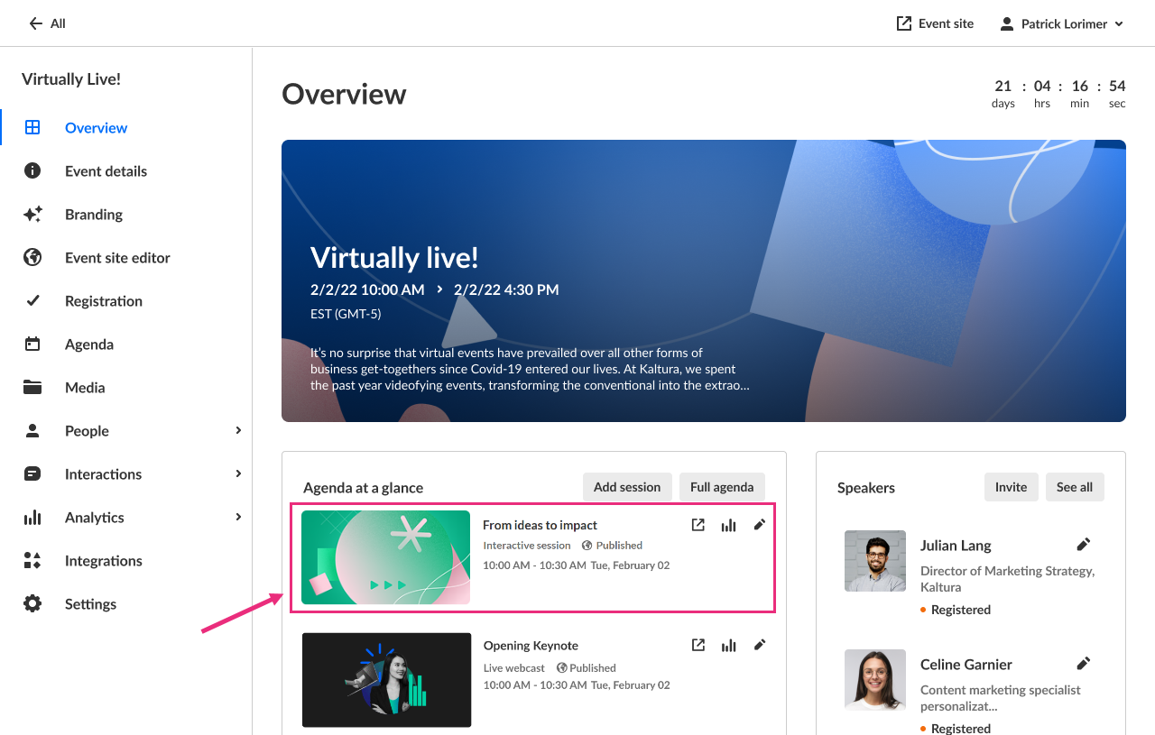 There are two ways to add a Pre-recorded session to your event: - On the Overview page, in the Agenda at a glance section click Add session.