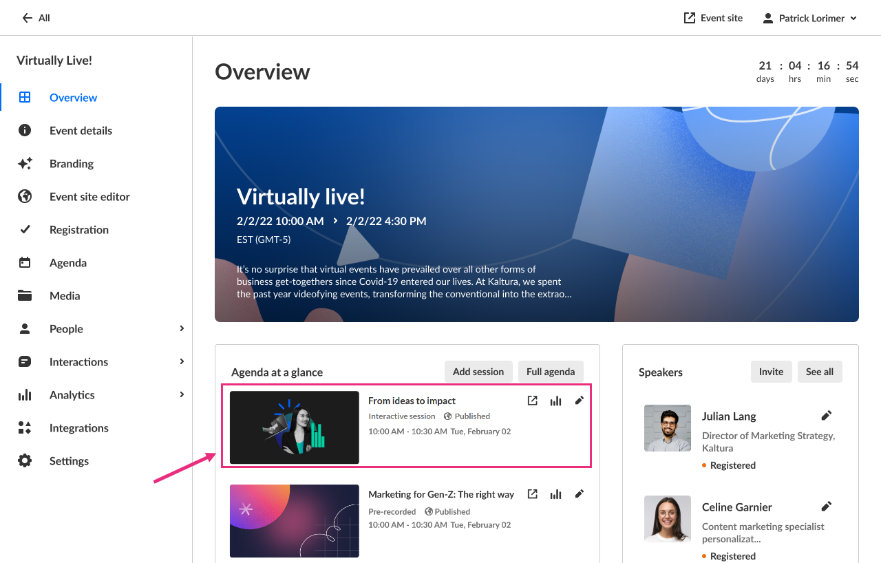 - On the Overview page, in the Agenda at a glance section click Add session.