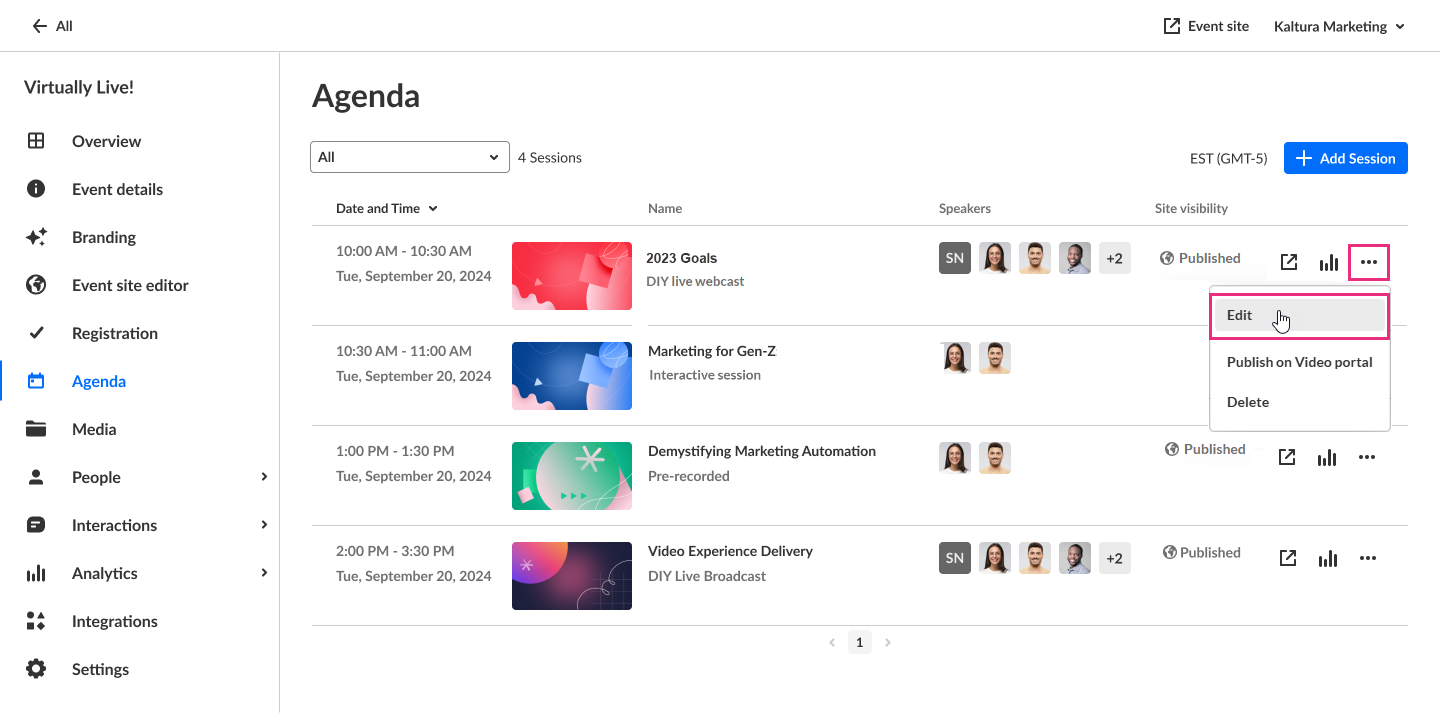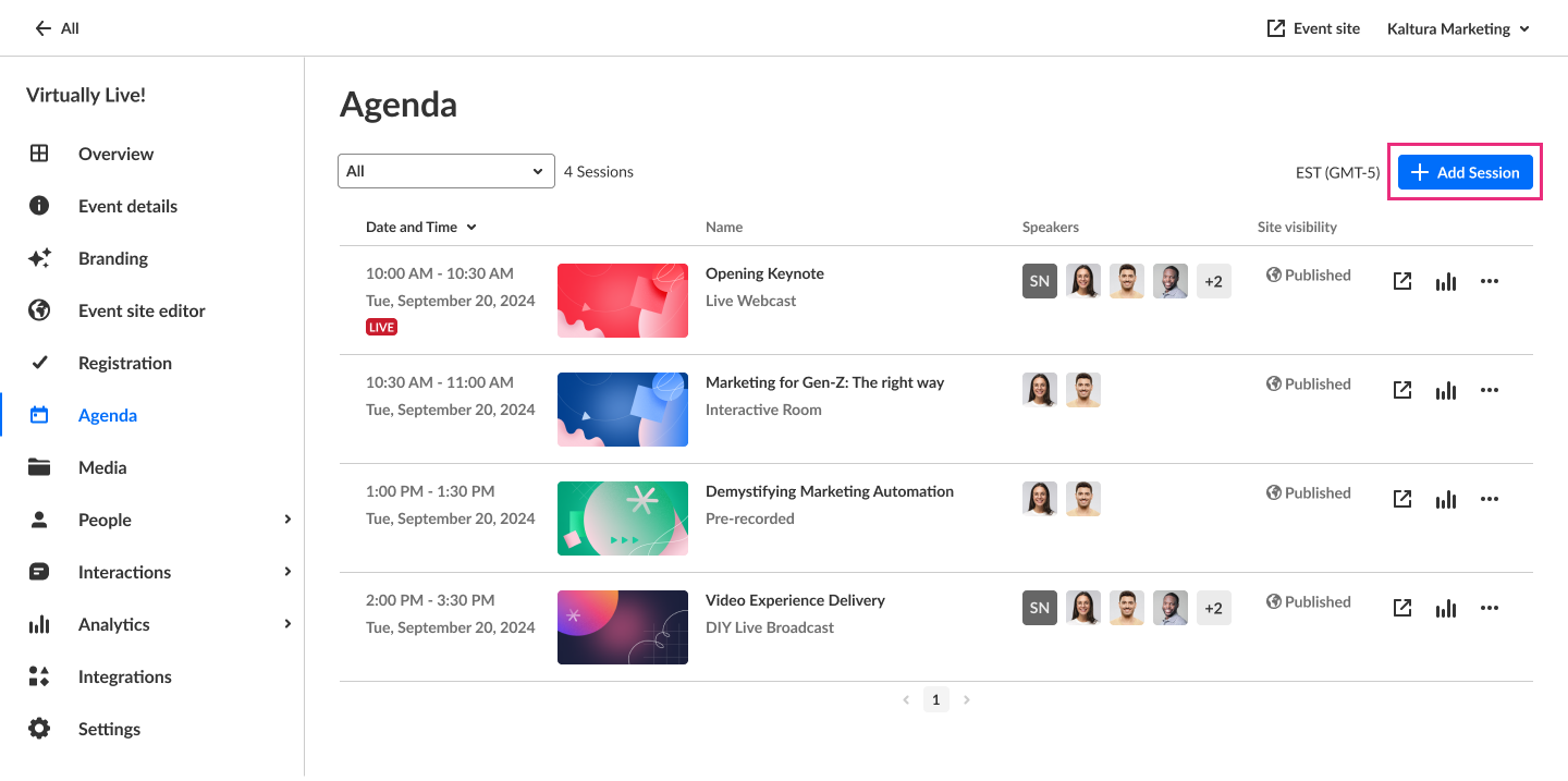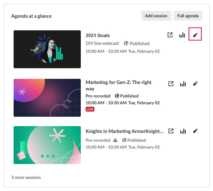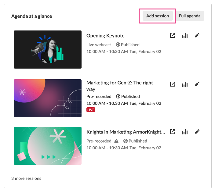 - On the Event Overview page, in the Agenda at a glance section, click Add session.