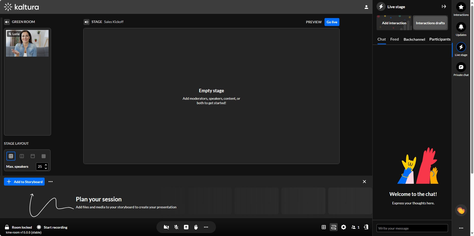 Once the session is created, the studio is automatically created as well and is hidden from the general attendees. Moderators and speakers may access the studio via a direct private link. This way, they can begin preparing the studio ahead of the broadcast. The agenda, on the other hand, is available to all on the event site.