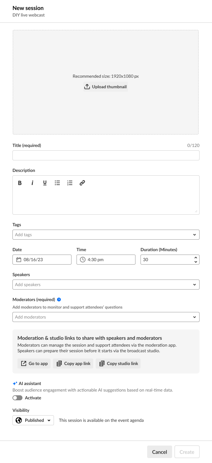 - Once you are finished completing the fields, click Create. (The Create button is enabled only after you've begun filling in the fields.) The new session is now added to your event.