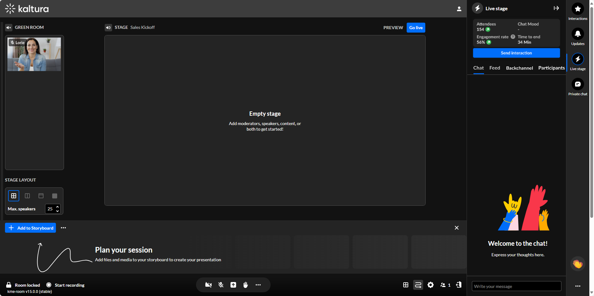 - The Live stage tab of the Chat and Collaboration widget displays information on attendee numbers, turnout (percentage of those registered who are actually logged into the session), engagement rate (viewers who watch in full screen or with the focus on the tab and sound on), and time to end.