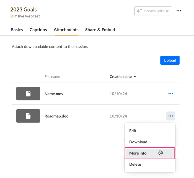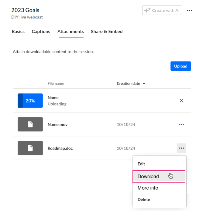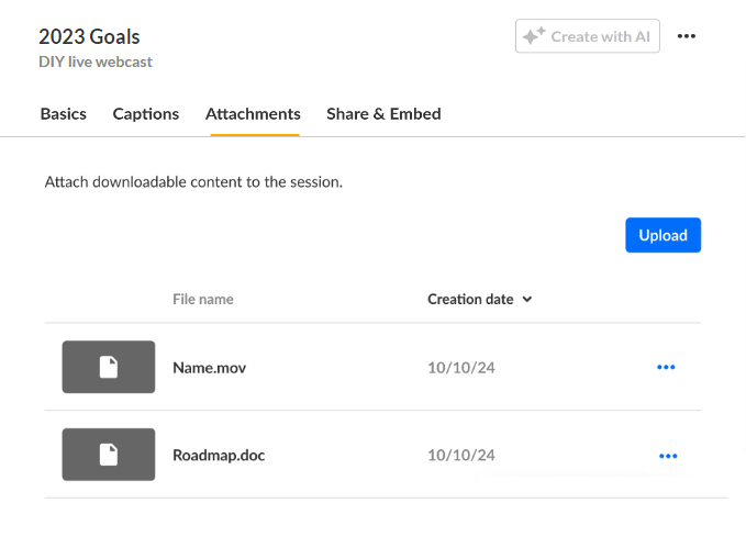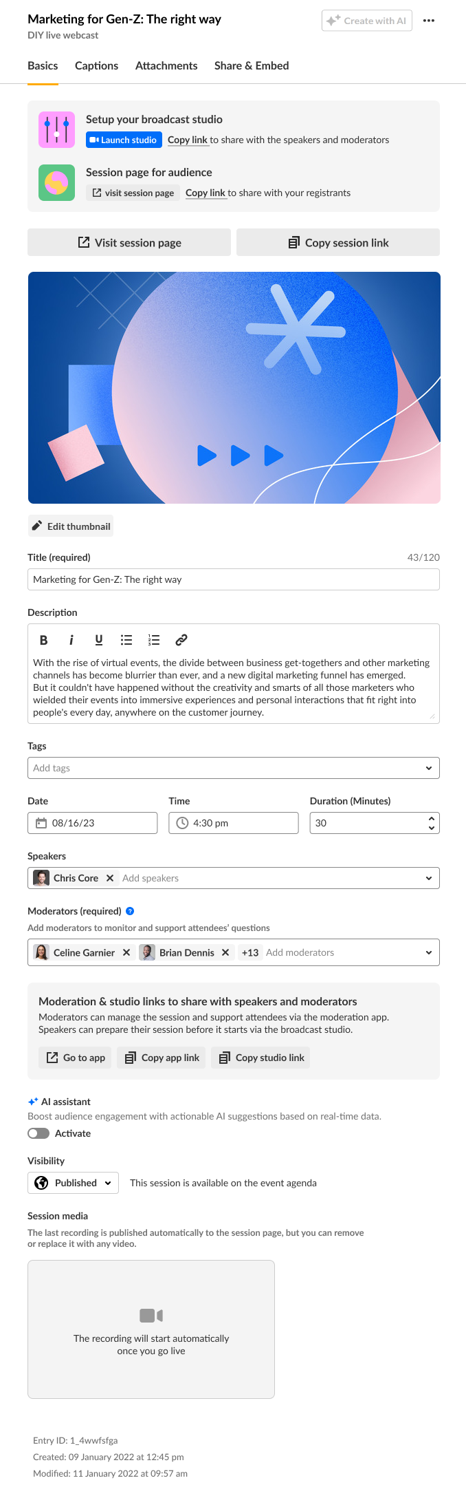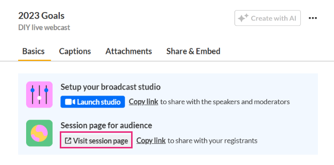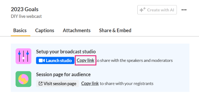 Copy studio link - Let the moderators and speakers assigned to the session access the studio and begin preparing ahead of the broadcast. See Copy Studio link to share with a moderator.