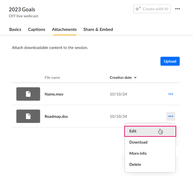 After you've saved your new session, one link becomes active and four additional links display via the Edit session page.