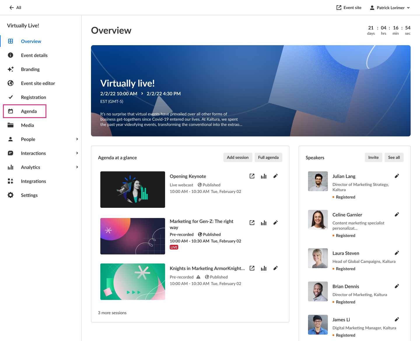 The Agenda page includes a link to the event site; simply click the Event site button on the top right corner of the screen. To learn more about your event site, see Getting to know your event site, session page, lobby page, and main stage.