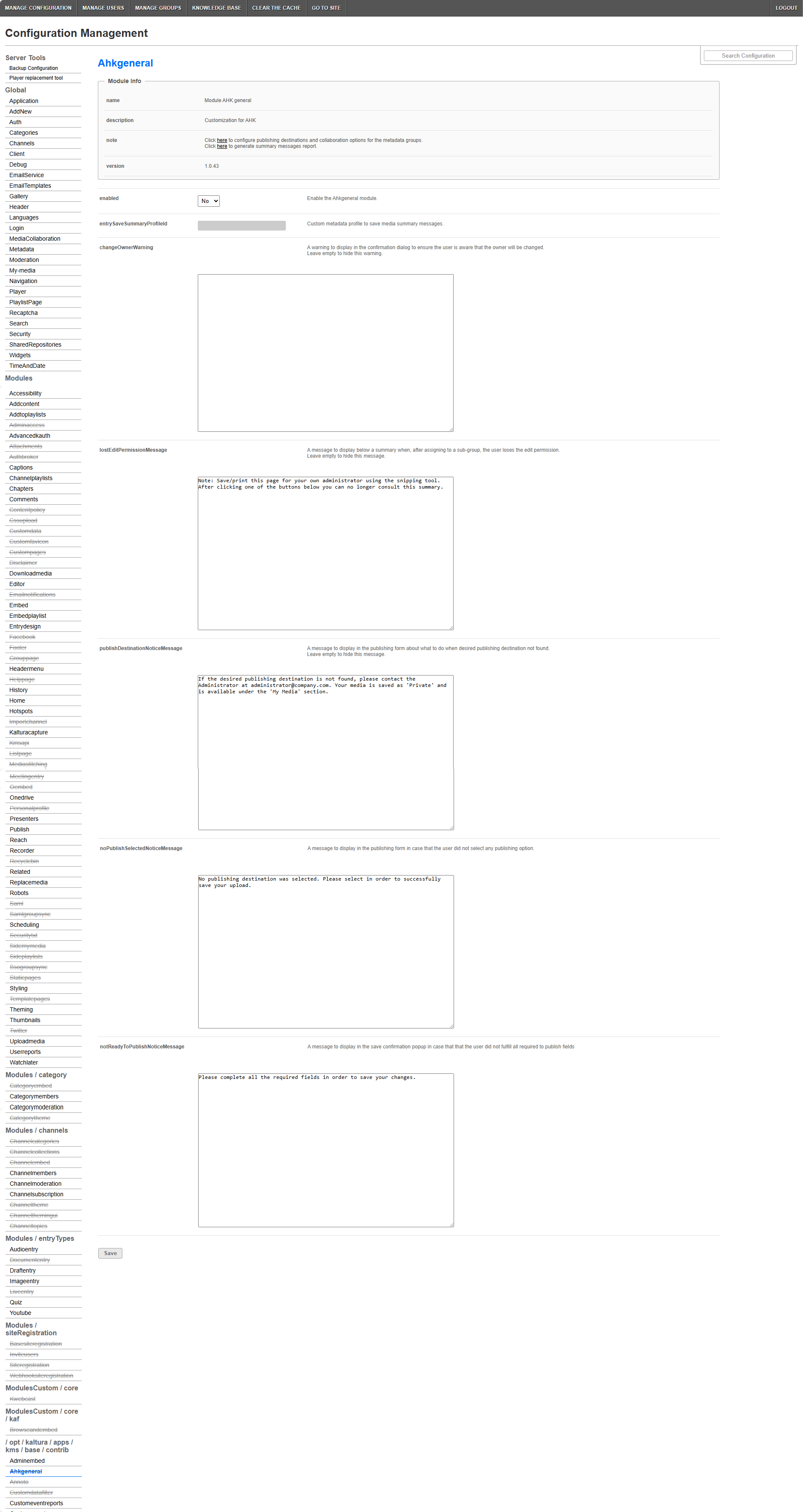 The AHK General module is for AHK customization. Enabling this module simplifies and automates KMS workflows for end users. End users will be shown only the relevant options (metadata schema) when uploading new content based on the configuration in the module. Customizable messages are designed to appear on both the upload page and the entry edit page.