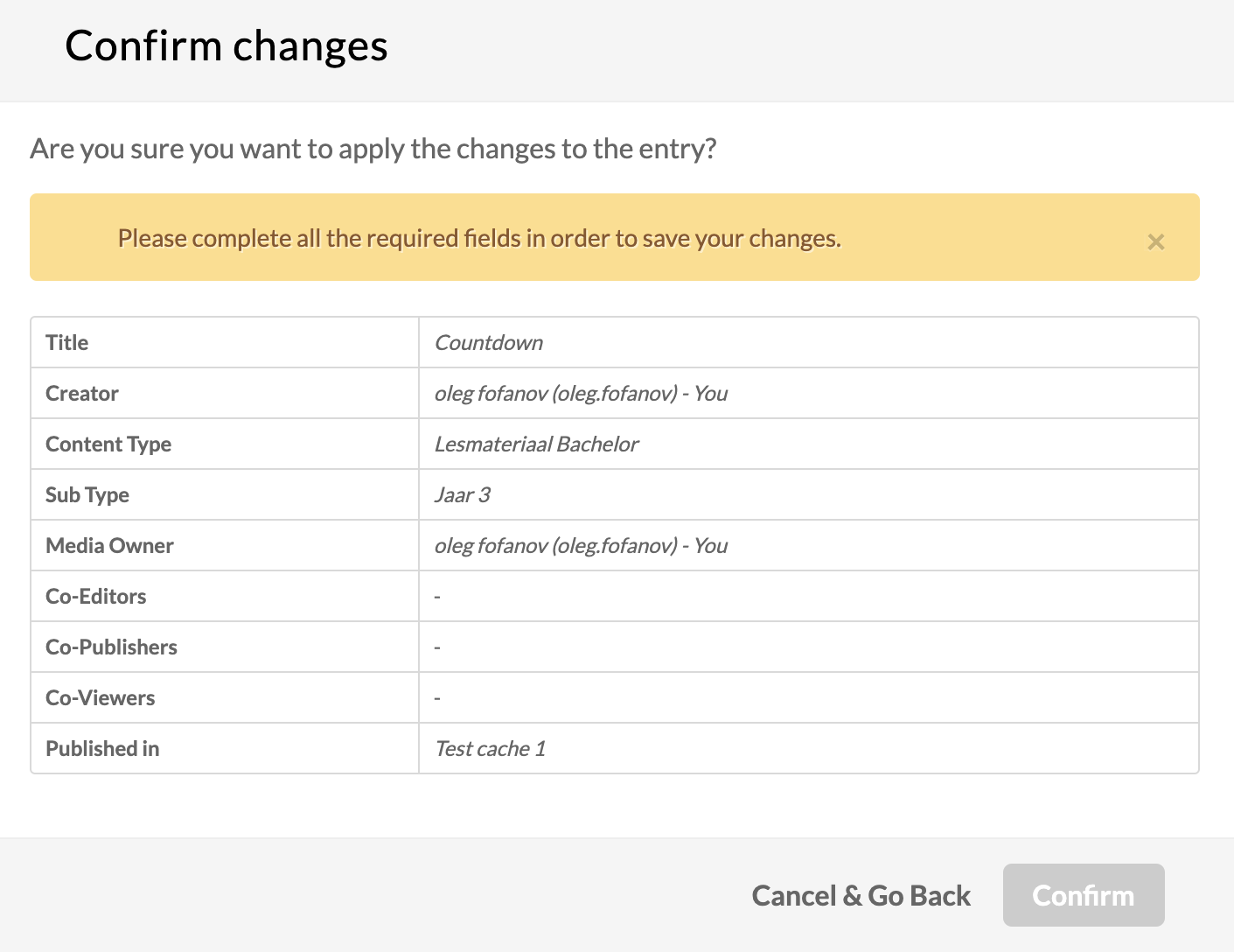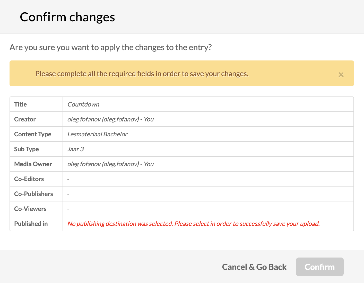 | notReadyToPublishNoticeMessage | Free text | A message to display in the save confirmation popup in case the user did not fulfill all required to publish fields. | ![]() |