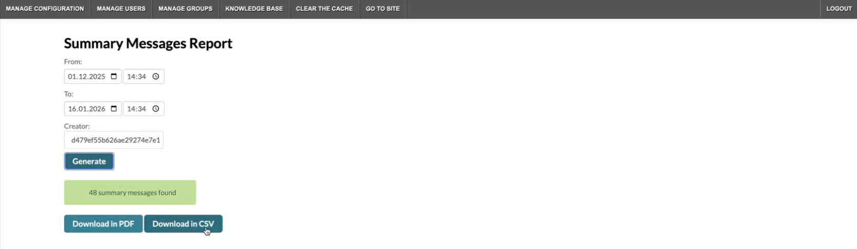- The second link allows the admin to generate summary messages reports per user.