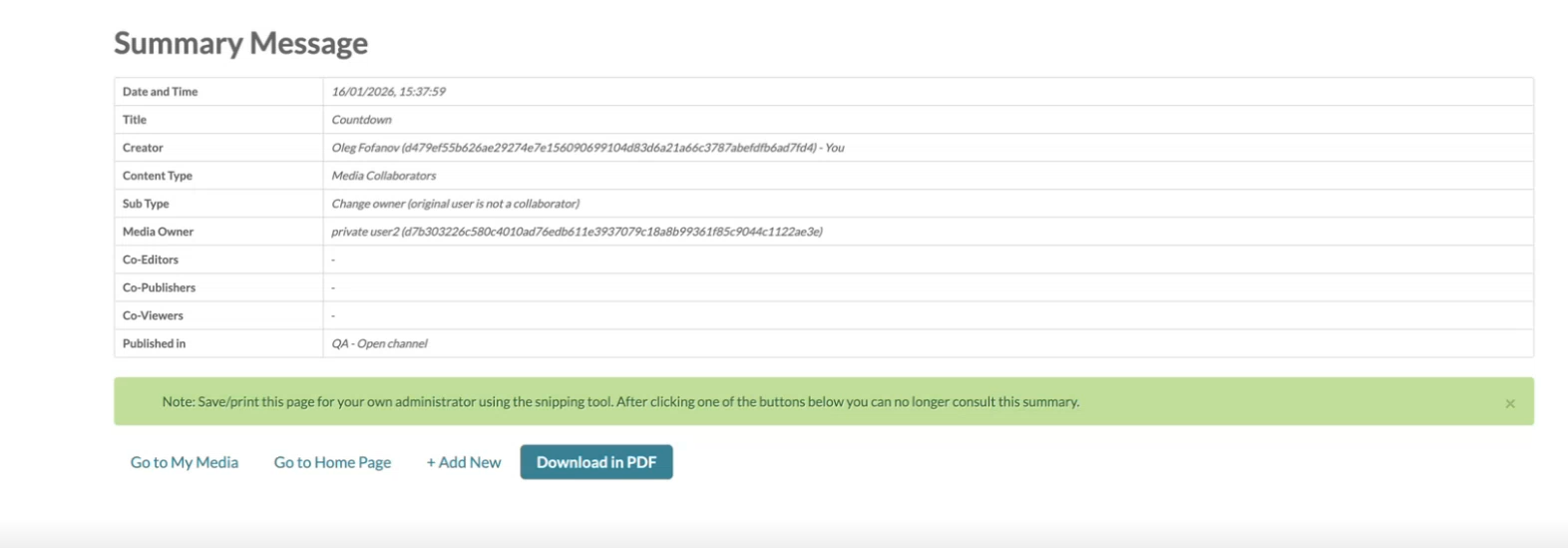 When changing the owner of an entry, a warning message may appear in the Summary Message asking you to save/print this page for your own administrator using the snipping tool and warning you that after clicking one of the buttons below the message, you can no longer consult this summary.