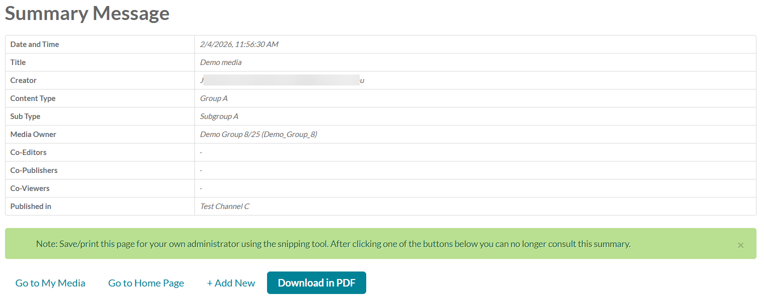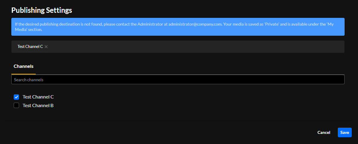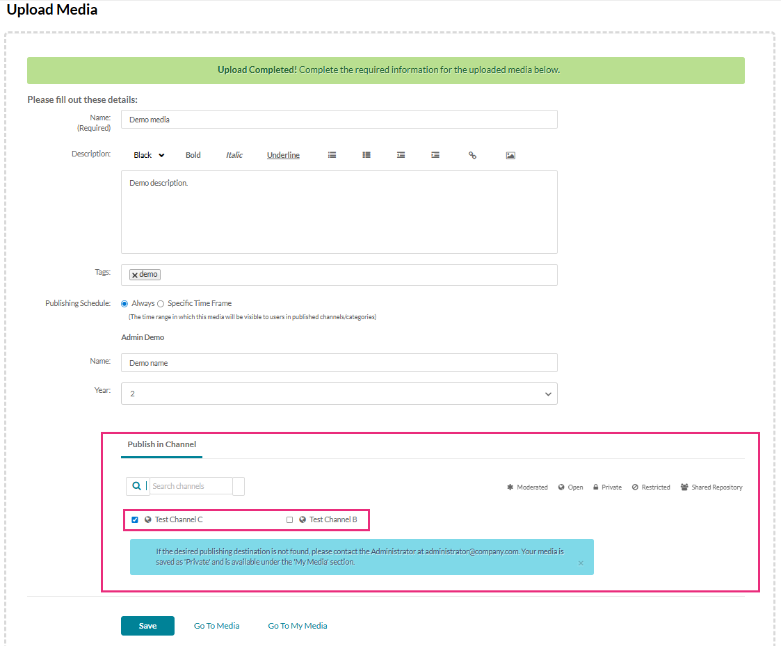 Here is just one example of a publishing process that has been customized by the admin. In this example, the user has just uploaded media and is asked to complete additional information. The admin has configured the channels to which media can be published. The user can choose to publish their media to Test Channel C and/or Test Channel B.