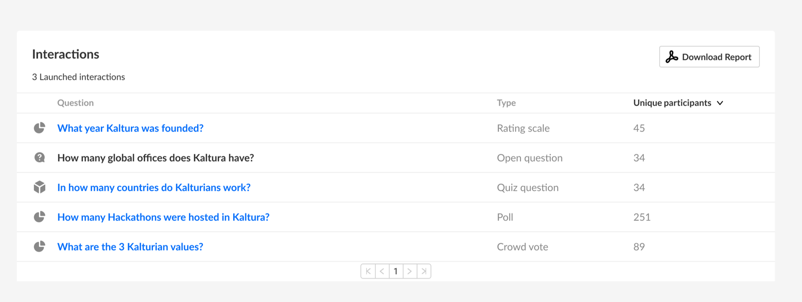 This section provides analytics for interactions created during the session, such as polls, quizzes, and rating scales. The table lists each interaction, including its type and the number of unique participants who responded.