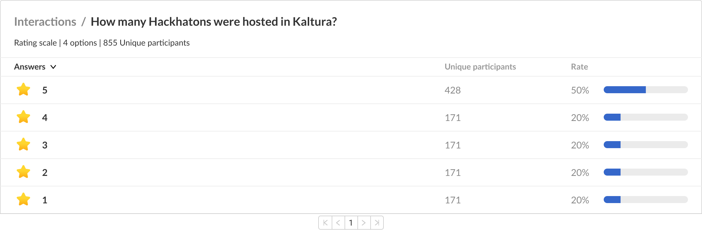 In the Rate column, the percentage of participants who selected each answer is displayed. This percentage is calculated by dividing the number of participants who selected a specific answer by the total number of participants who responded to the interaction.