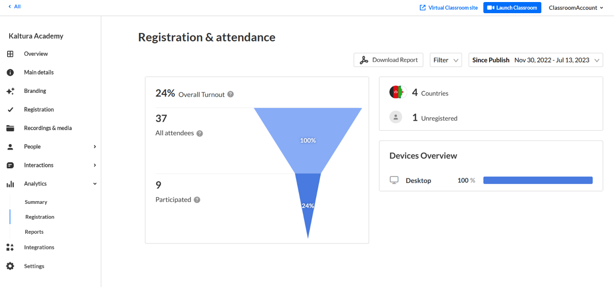 This article describes how to view registration and attendance analytics on a virtual classroom and download a PDF version of the dashboard.