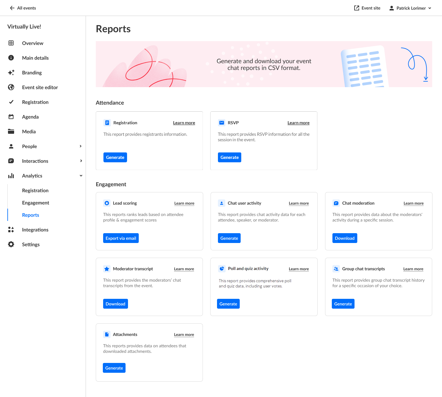 The Reports page allows you to generate, export via email, and download your event reports in CSV format.