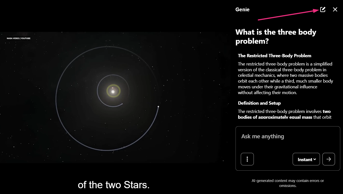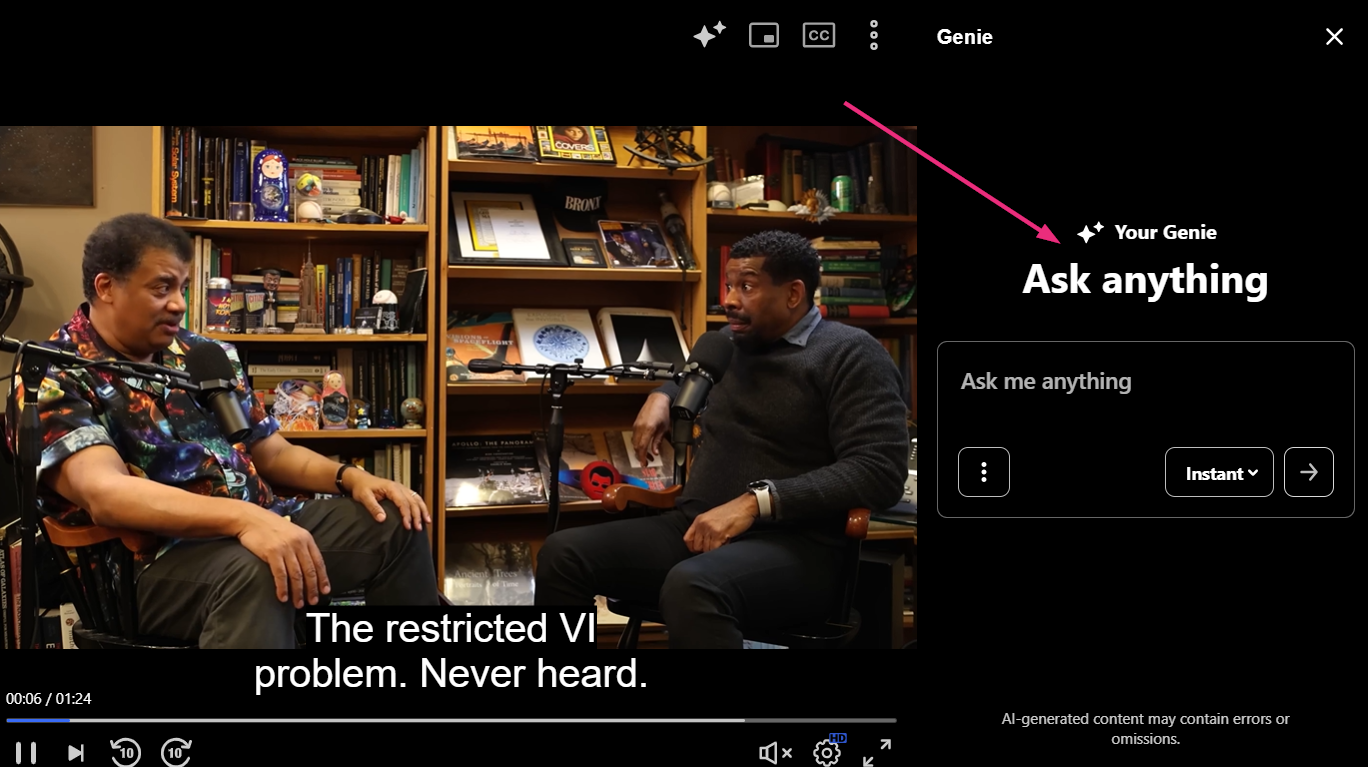 Single-video Genie lets you ask questions about the video you’re watching and get answers based only on that video. Genie is designed to help you review course videos, clarify concepts, and find key moments faster.