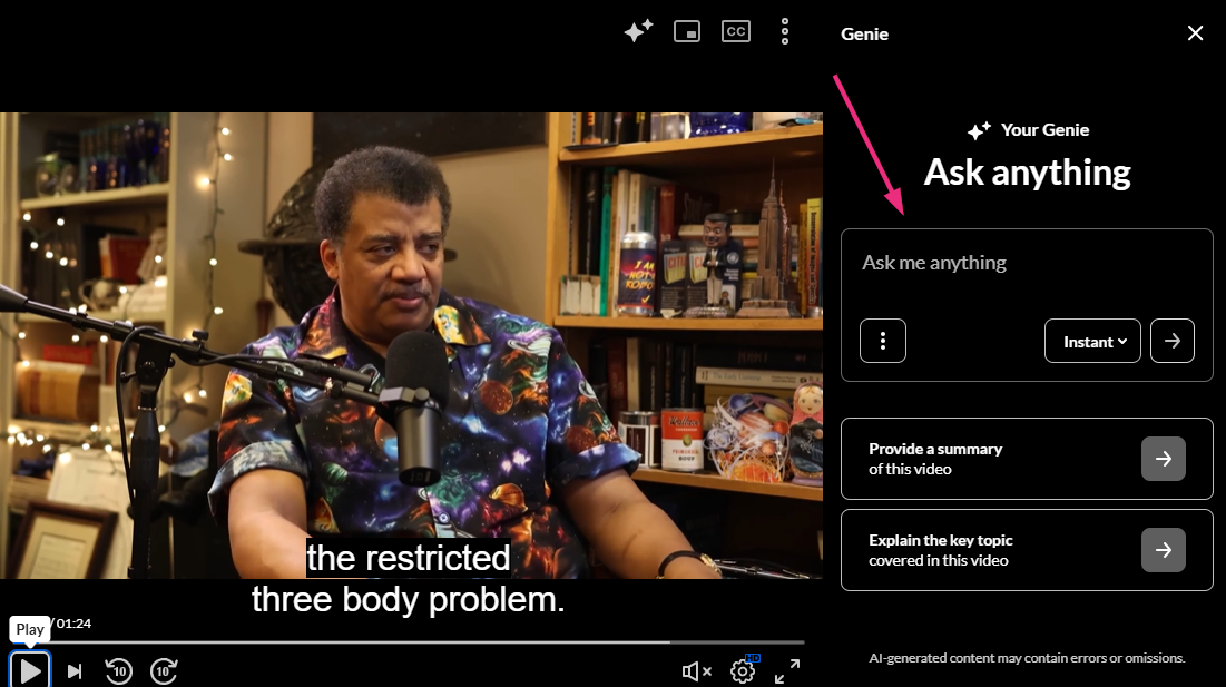 Single-video Genie lets you ask questions about the video you’re watching and get answers based only on that video. Genie is designed to help you review course videos, clarify concepts, and find key moments faster.