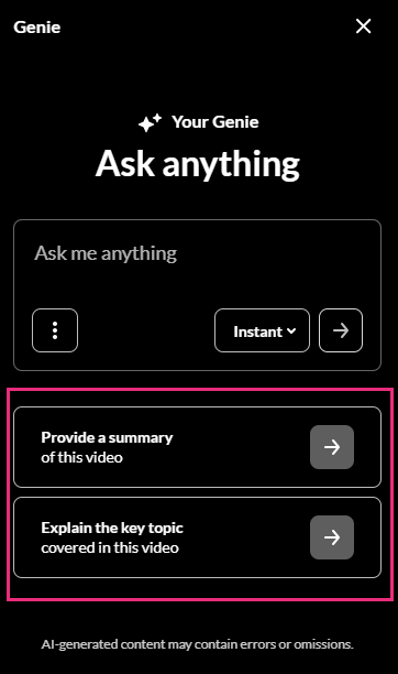 Single-video Genie includes preset questions to help you get started quickly. You can use these to ask Genie to: