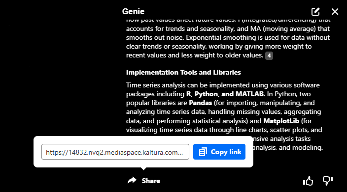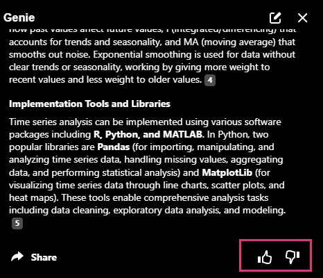 Providing feedback on Genie’s responses plays a crucial role in improving its accuracy and future recommendations. You can rate any answer using the thumbs up or thumbs down icons.