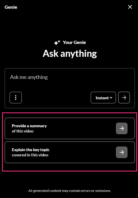 Single-video Genie includes preset questions to help you get started quickly. You can use these to ask Genie to: