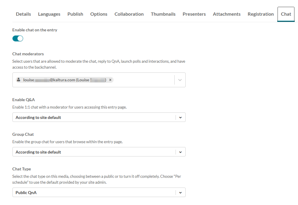 To configure chat features such as Q&A, group chat, or disabling chat, see Chat settings for Kaltura Rooms.