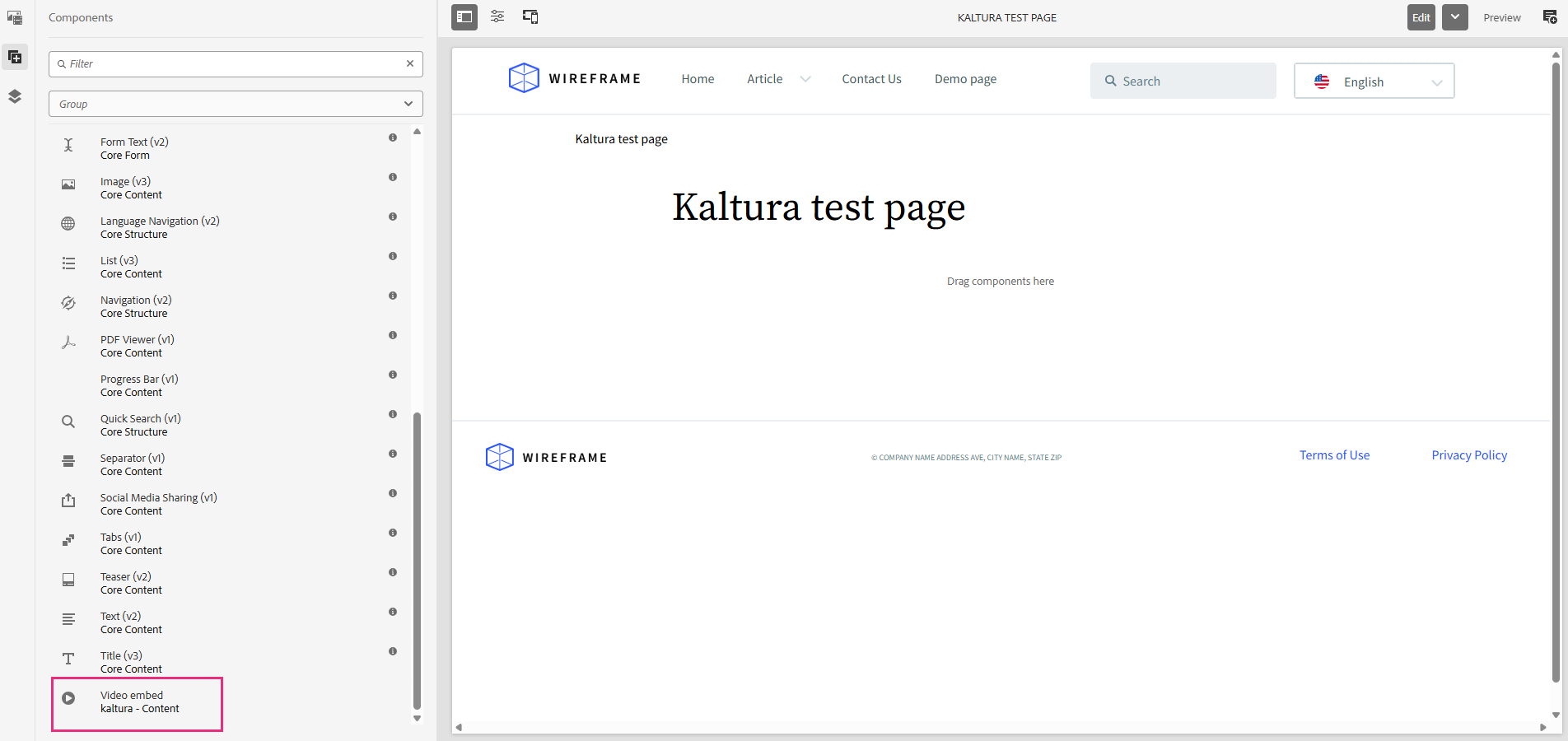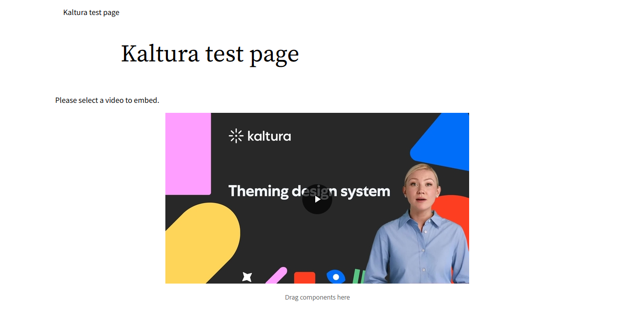 - Open the Components panel on the left, and drag the Kaltura Video component onto the page.