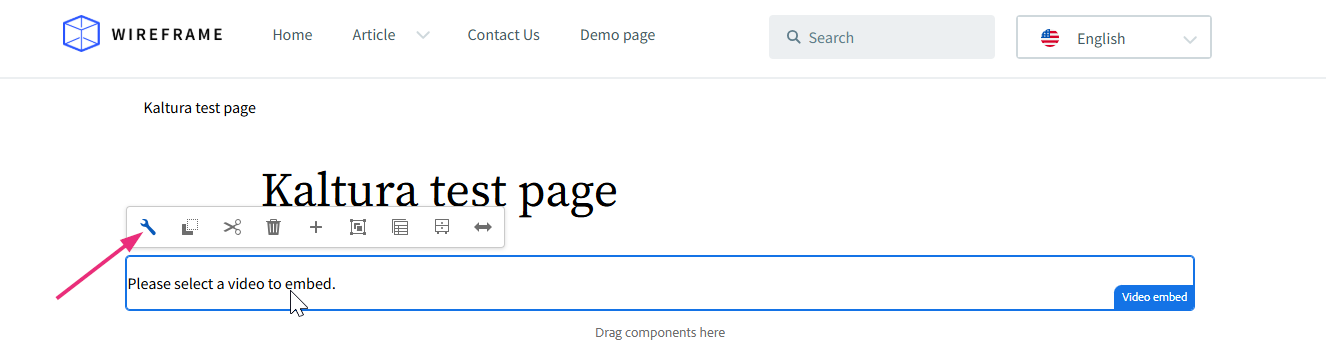 - Select the Kaltura video component on the page, and then click the wrench icon.