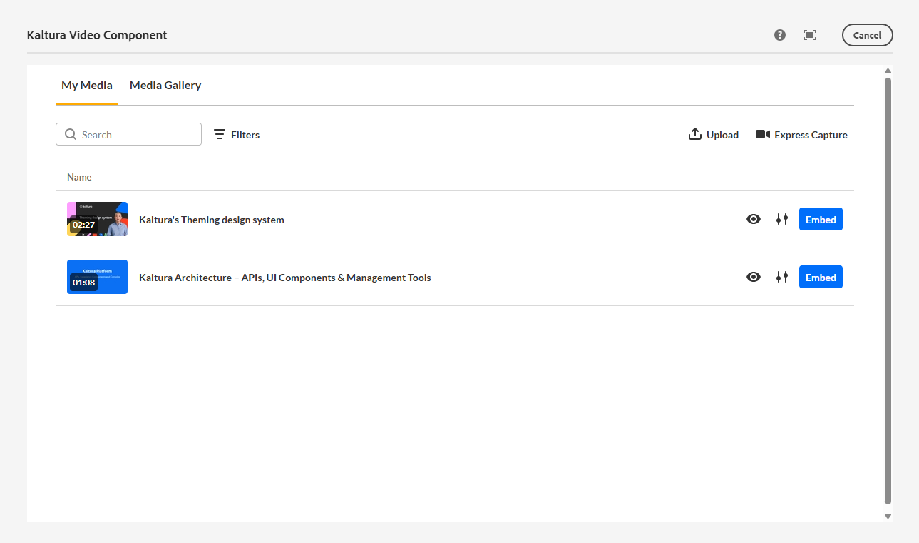 Note about permissions: Webmasters can browse and embed approved media they have access to in Kaltura. Uploading and managing video files is handled by a separate media or marketing role. If required media is not available, contact your Kaltura administrator.