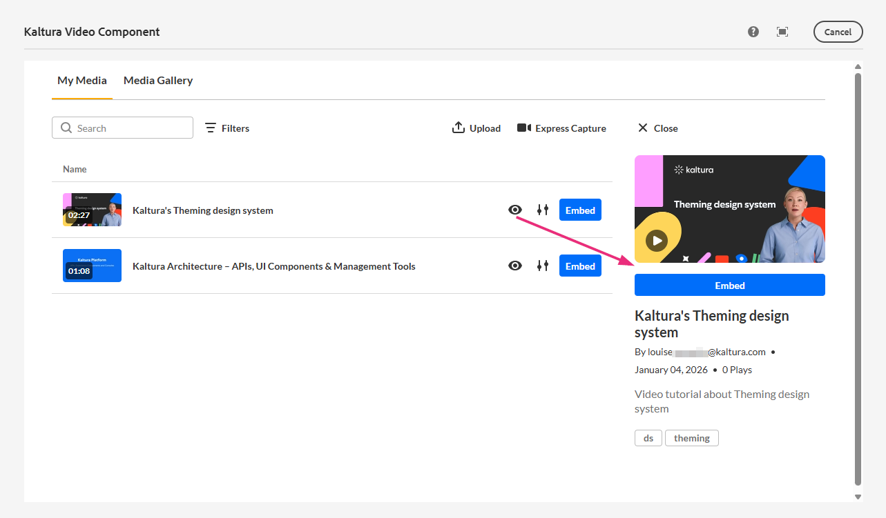 - In the Kaltura video component window, select a different media item.