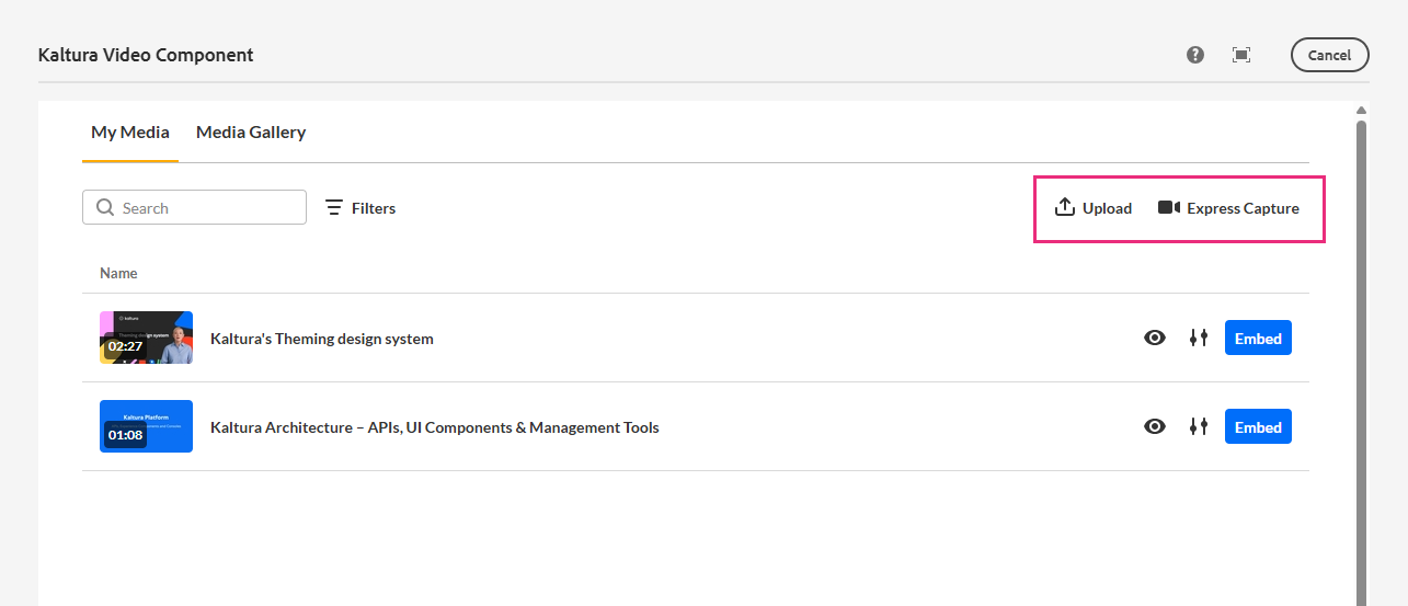 Watch a quick tutorial: Upload and embed a Kaltura video: