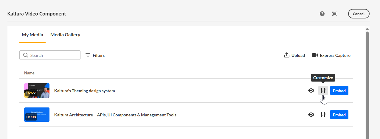 1. Click the customize icon next to the media you want to embed.