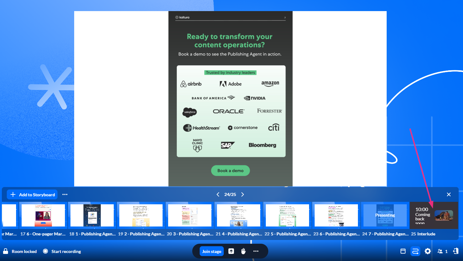 - End interlude: Stops the screen and returns the session to the live room.