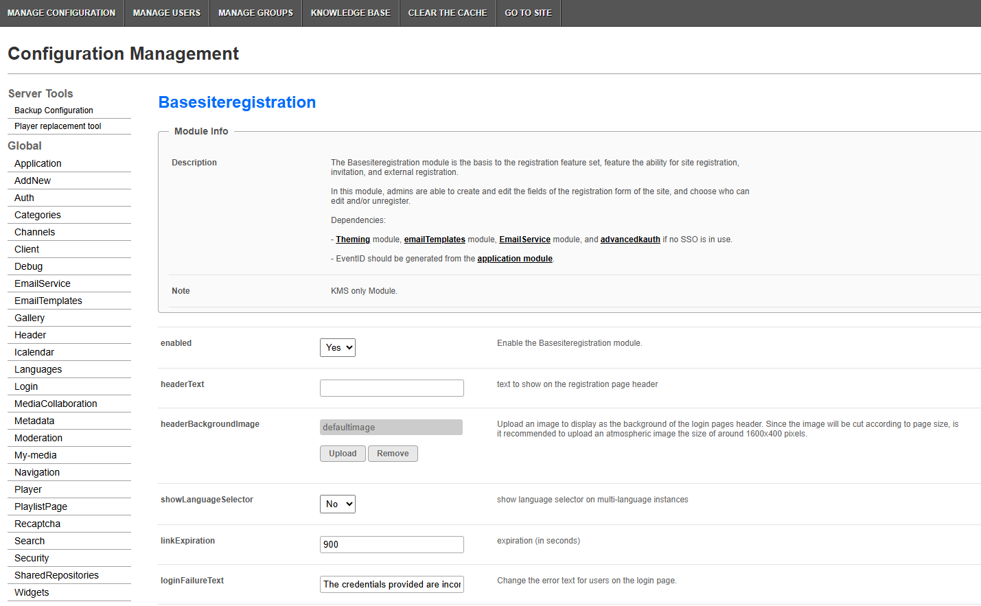 The Basesiteregistration module is the foundation for registration features. It enables site registration, invitation-based registration, and external registration.