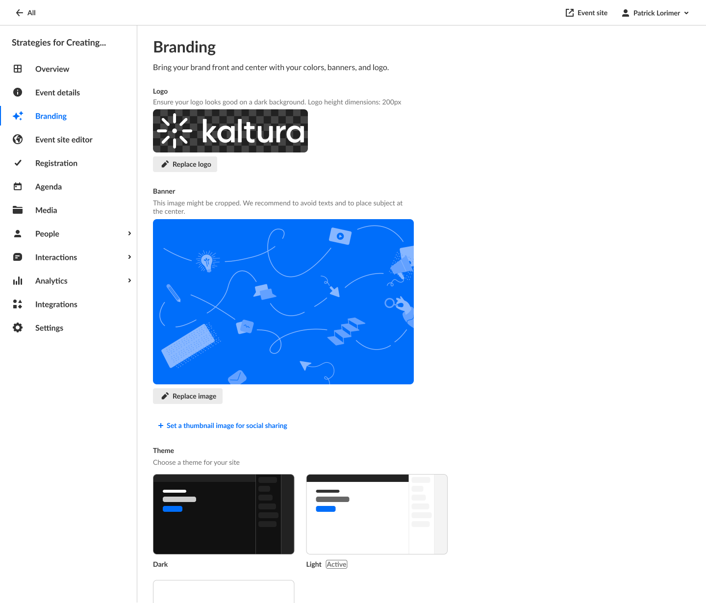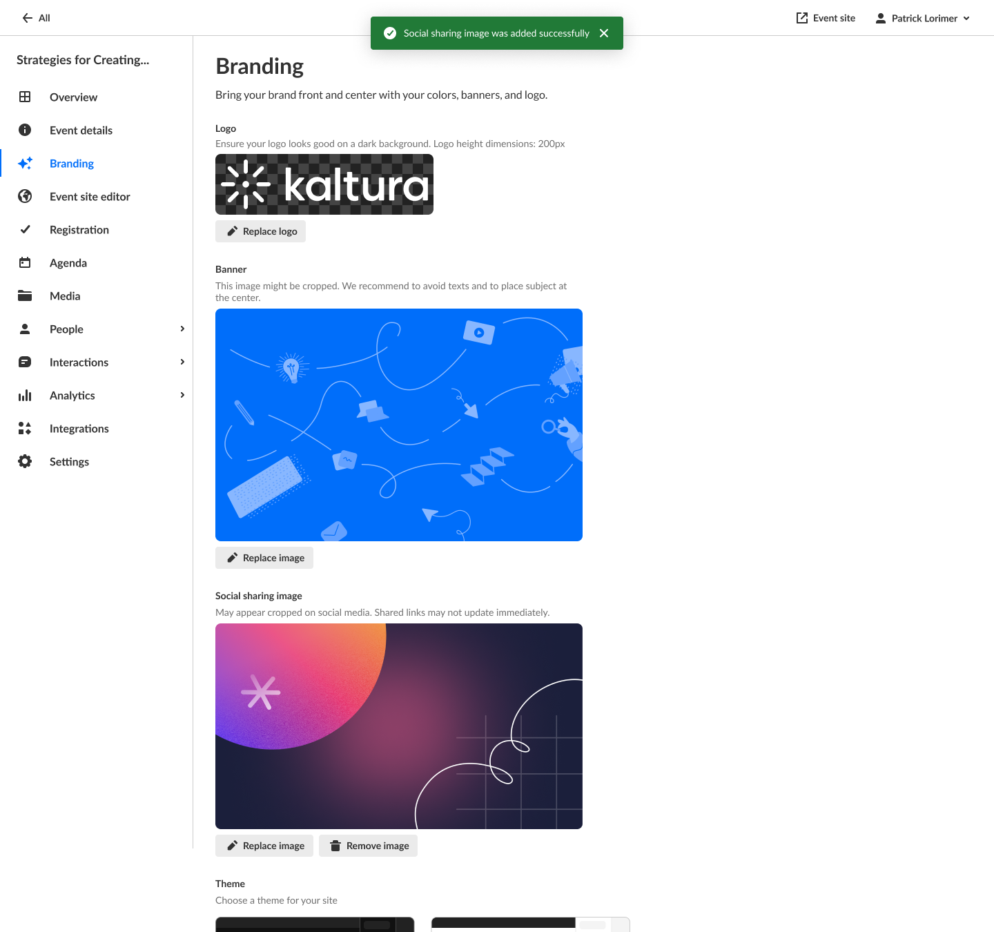The Branding page allows you to edit the logo, banner, and theme for your event, as well as set an image for social sharing.