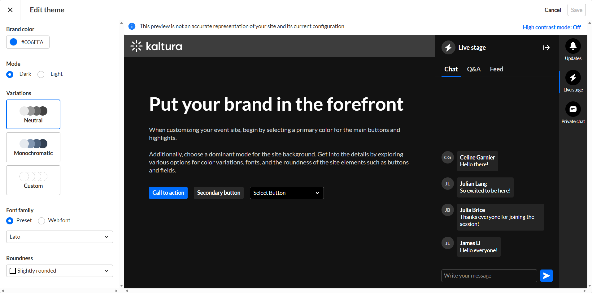 If your Kaltura Events account is configured with Custom Templates, and when creating your event, you chose a Custom Template (see Create an event), please do not edit the event theme on the Branding page. Doing so will override your Custom Template settings.