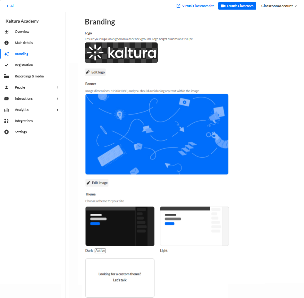 The Branding page allows you to edit the logo, banner, and theme for your virtual classroom.