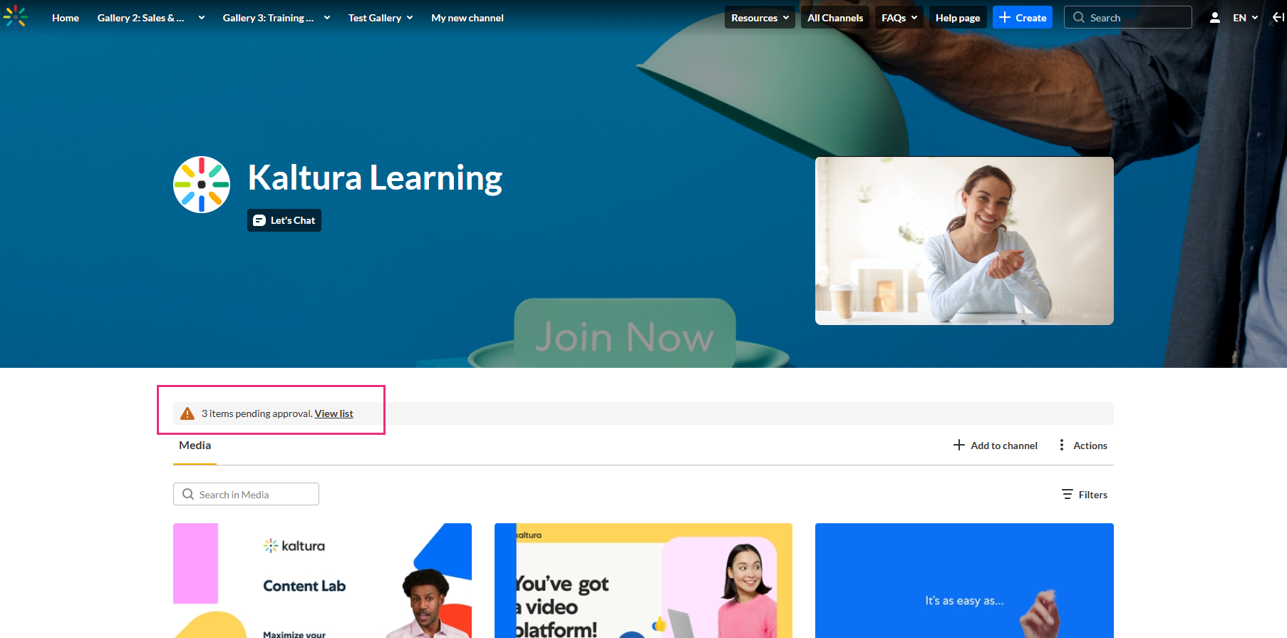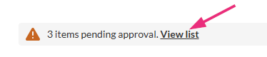 If there is pending media, a notification displays under the channel header: [x] items pending approval. View list.