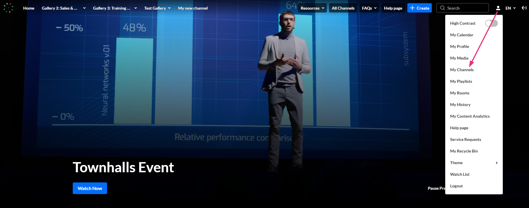- Go to the desired channel page. You can do this by selecting My Channels from the user menu.