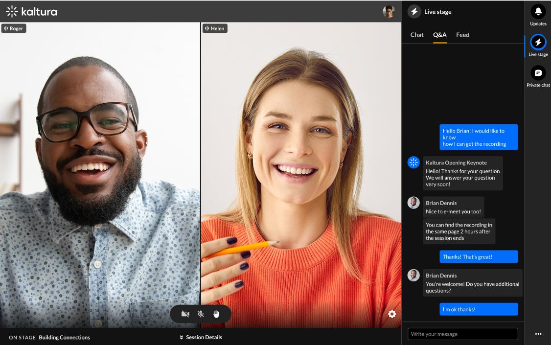 The chat and collaboration features in the Live Stage tab vary depending on whether your account administrator has enabled a Public Q&A experience.